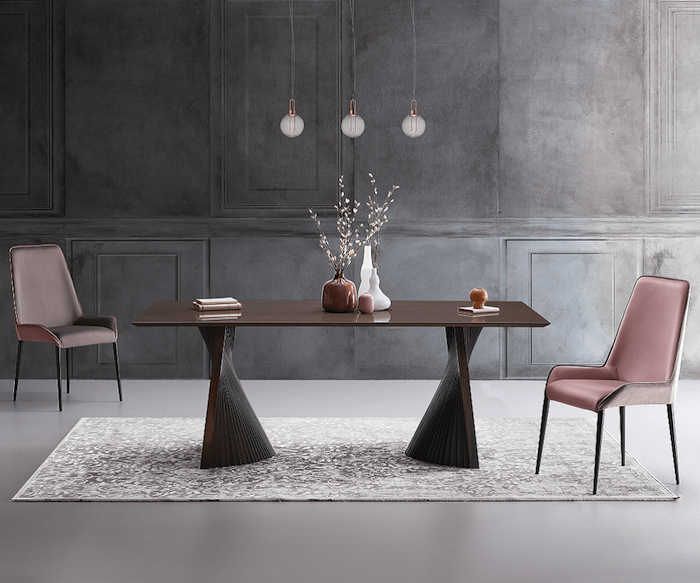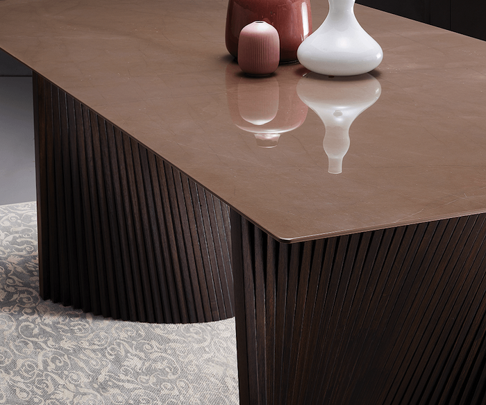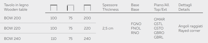 Bow представляет собой приятное сочетание двух материалов: дерева — дуба или ясеня, с помощью которого создаются полосы для формирования двух ножек стола вручную, и каменной столешницы (керамика/мрамор) необычной формы благодаря закругленным углам.