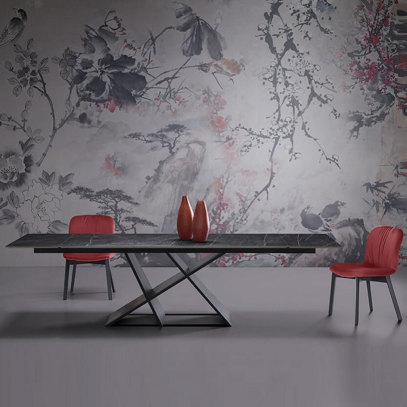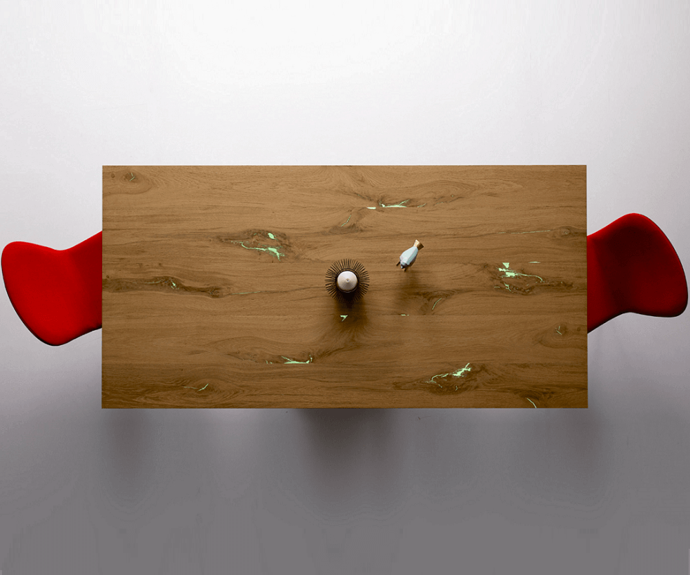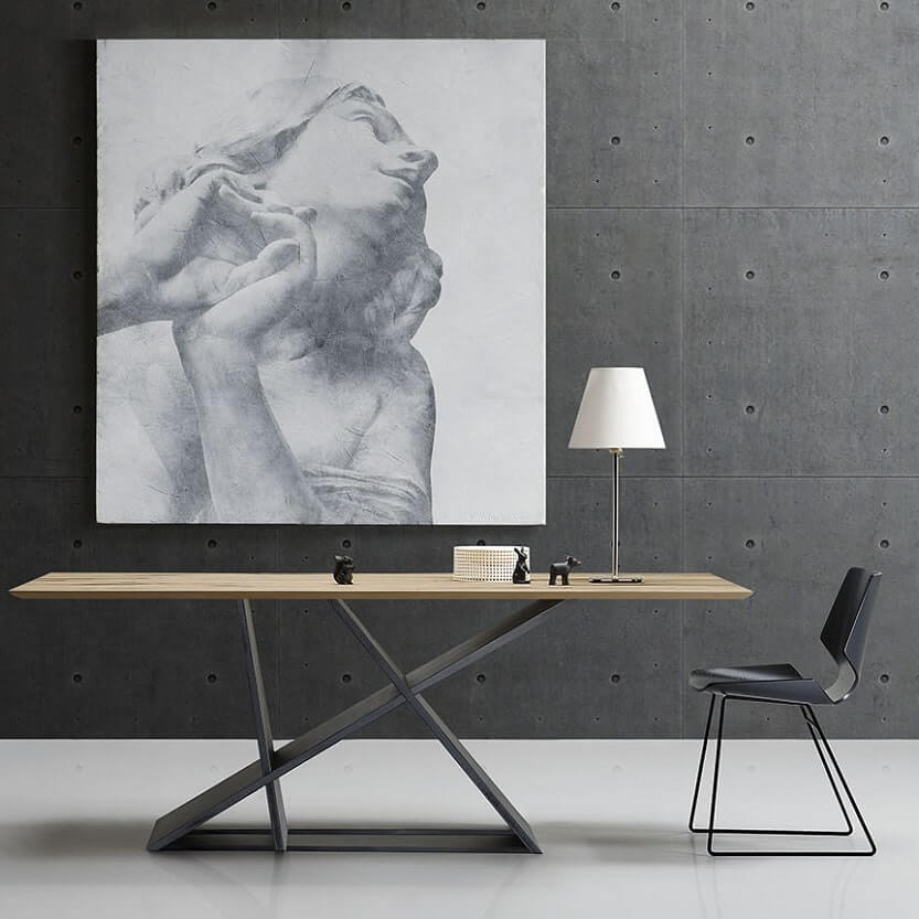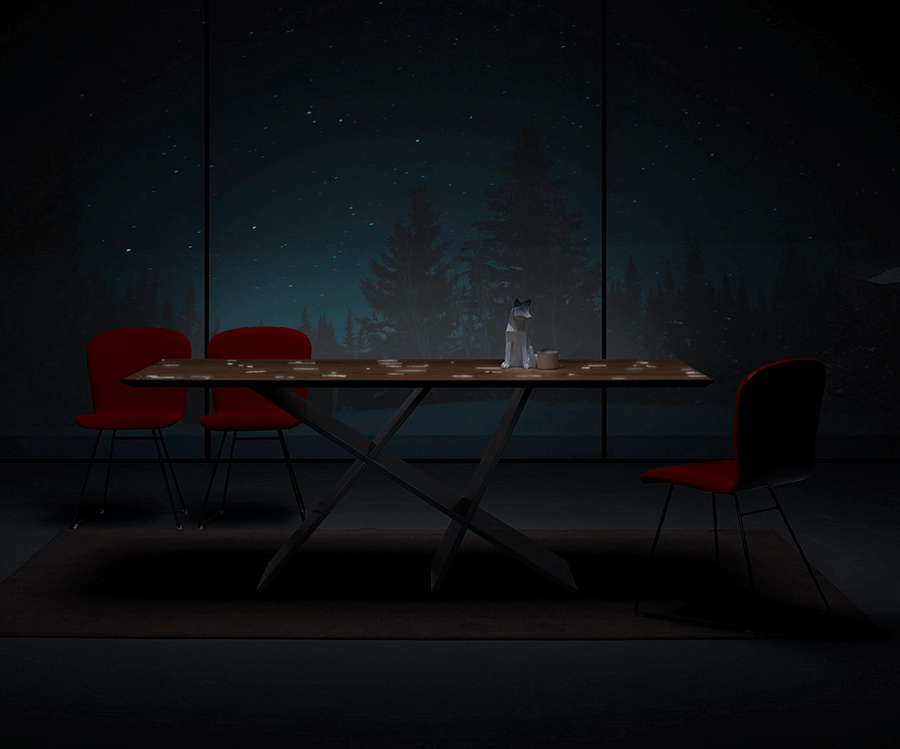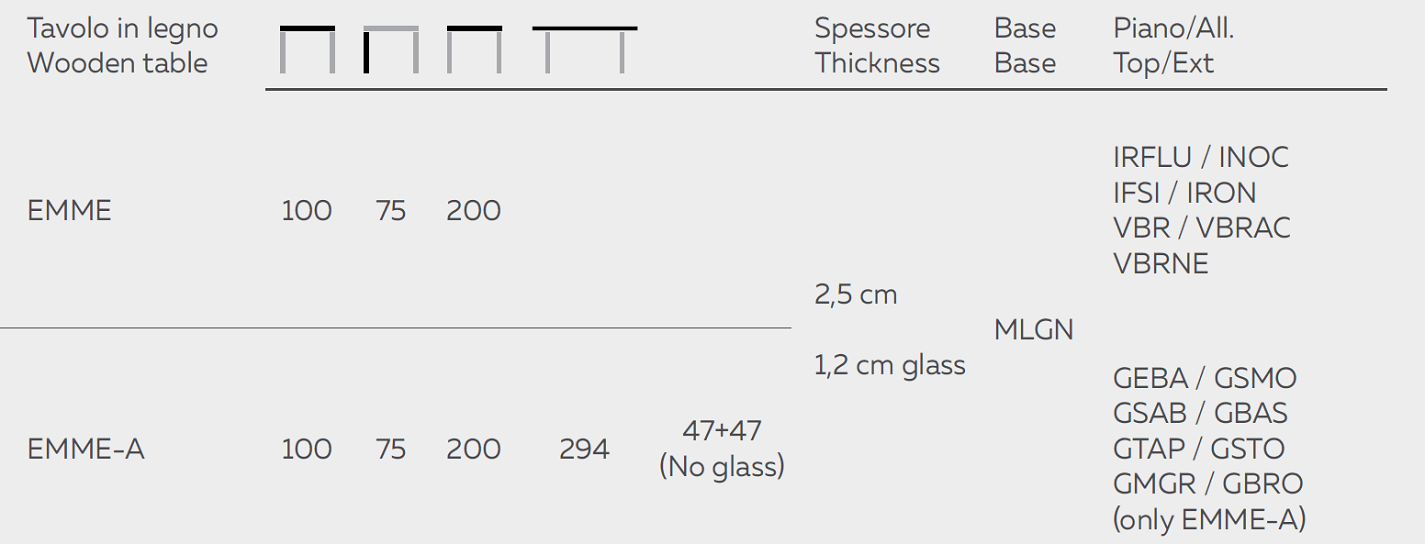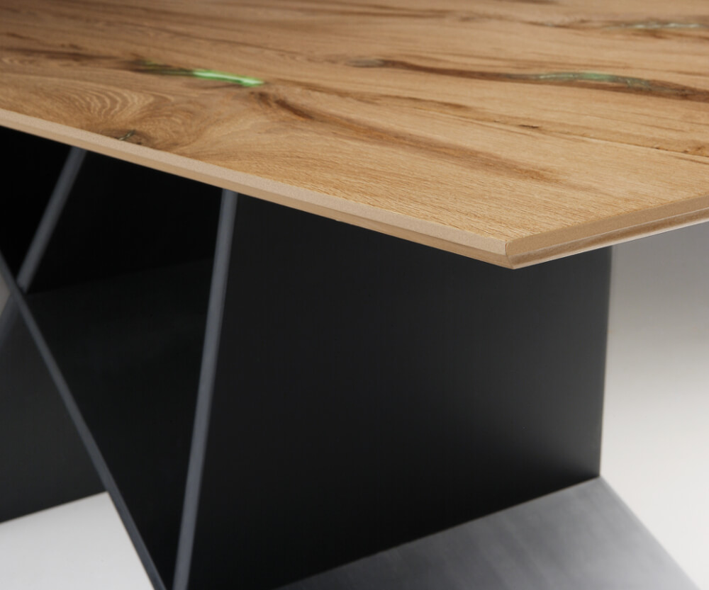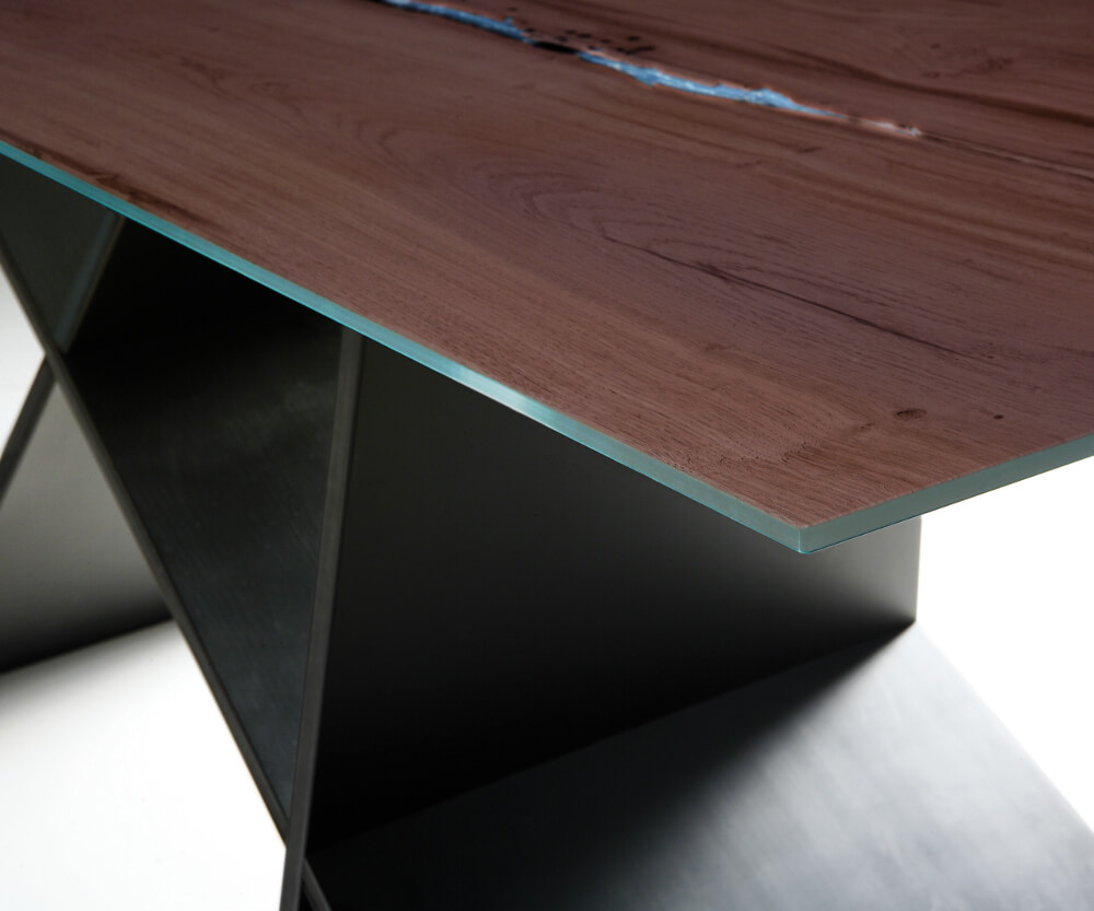 Стол с четкими линиями, похожими на современную скульптуру, имеет прямоугольный топ, доступный в различных вариантах отделки (дерево, стекло, керамика/мрамор). Вариант из дуба с узлами, заполненный смолой демонстрирует всю красоту натурального дерева. Доступен в раздвижной версии.