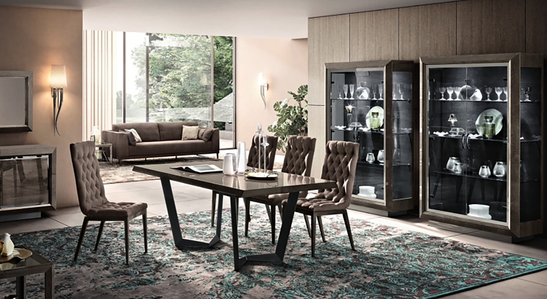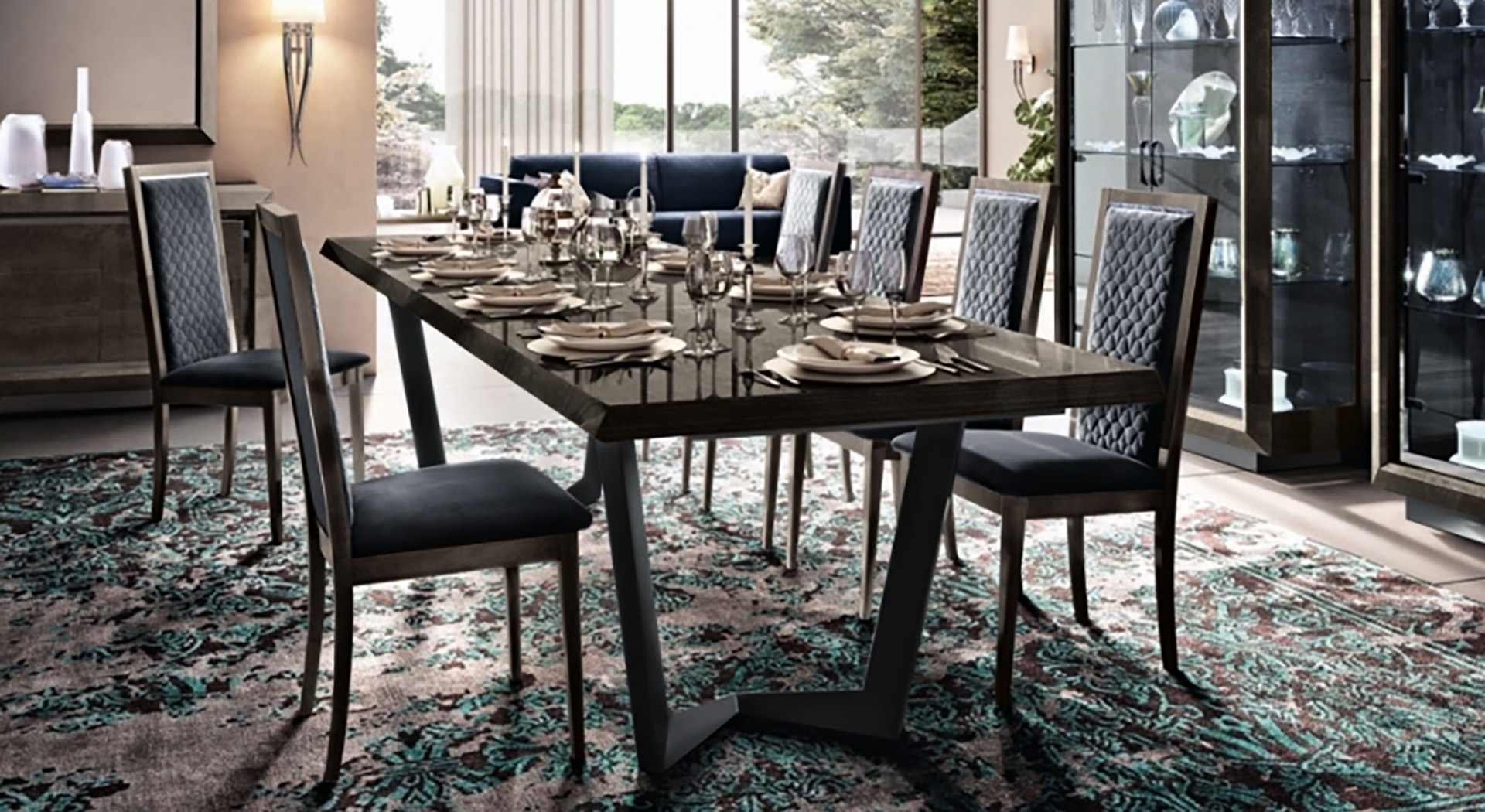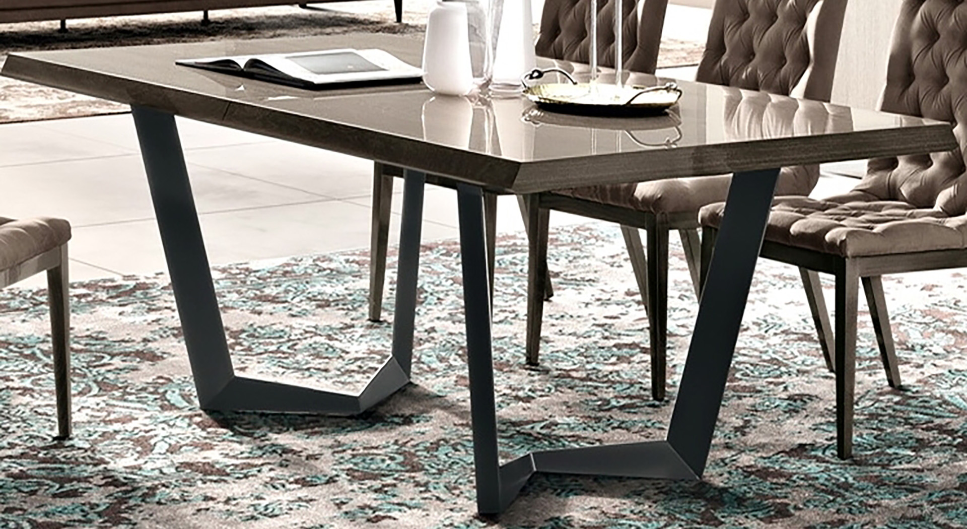 Обеденный раскладной стол с высокопрочным глянцевым лаком. База стола выполнена из фигурной стали с порошковым покрытием в отделке антрацит. Механизм раскладки из алюминиевого профиля в отделке матовый антрацит, контрастирующий с глянцем столешницы.