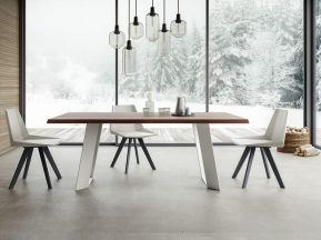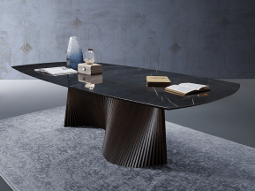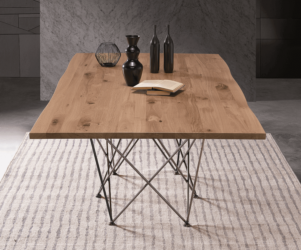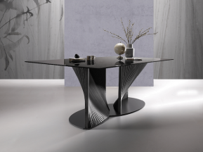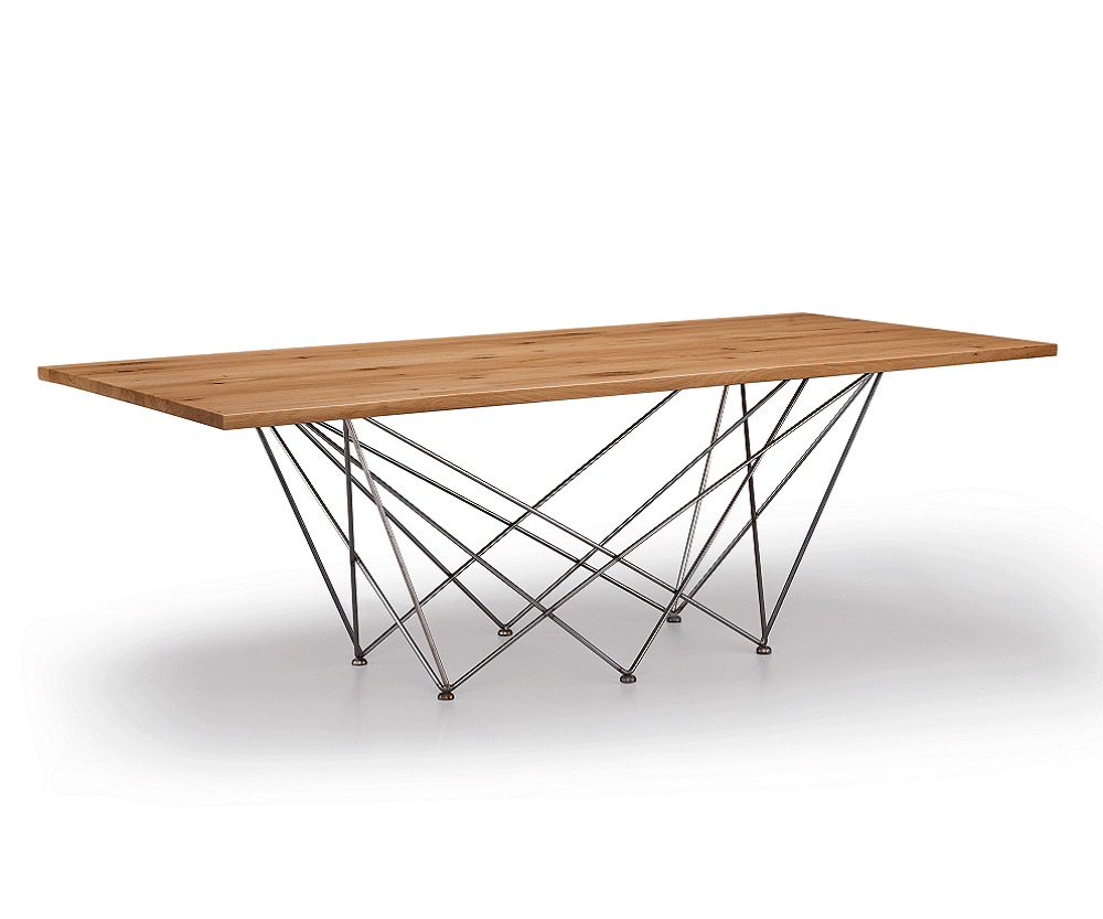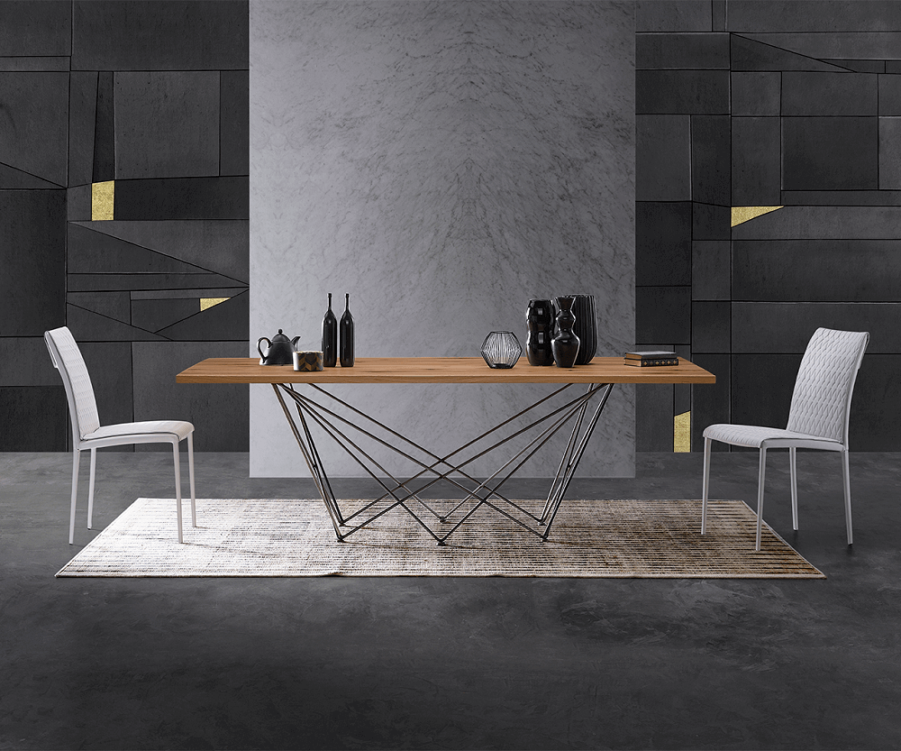 Стол во имя абсолютной современности: основание, образованное геометрическим переплетением серо-черных лакированных металлических линий. Верх бывает двух разных размеров и доступен из шпона или массива дуба.