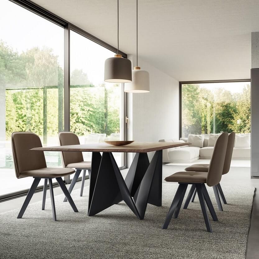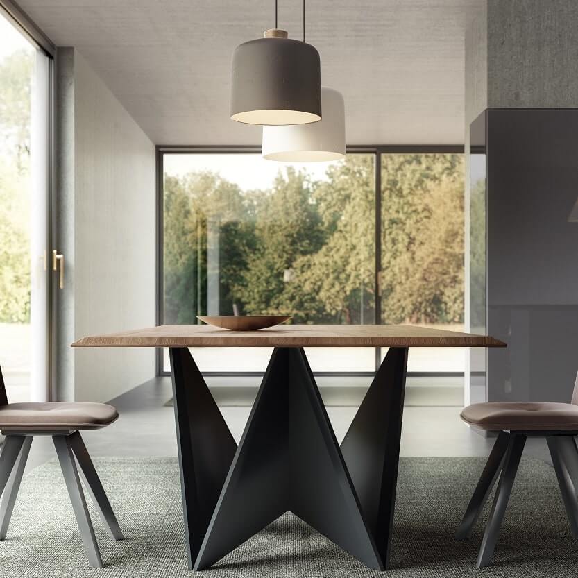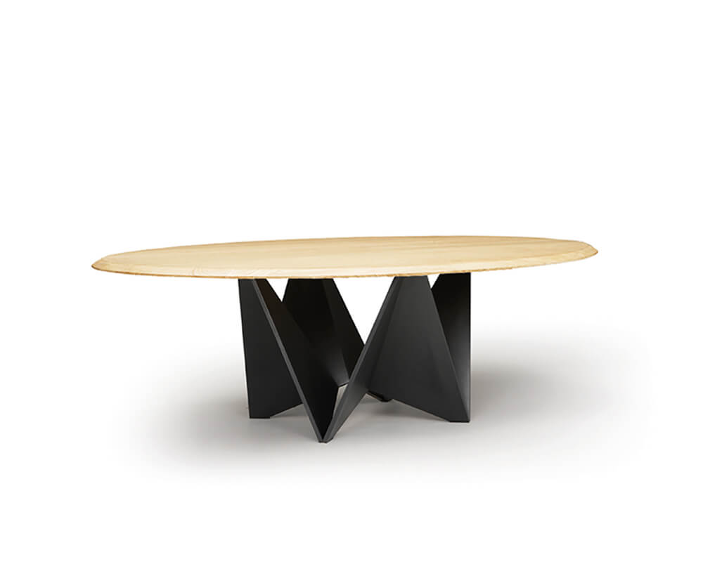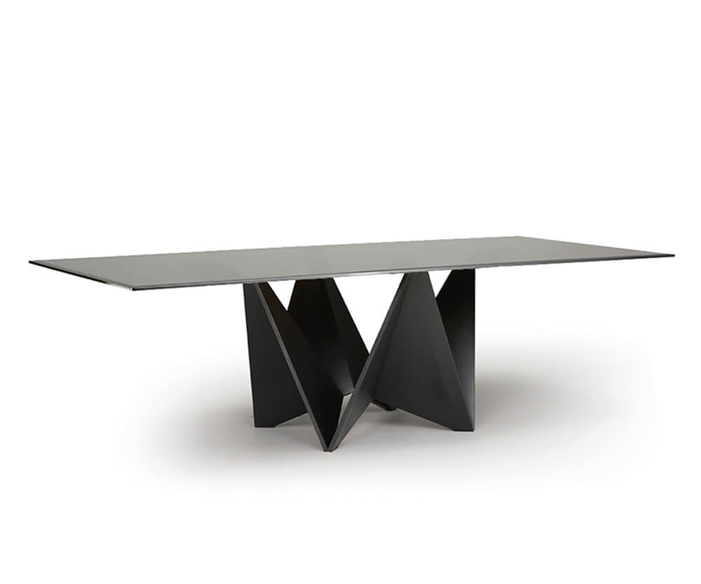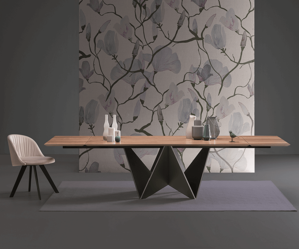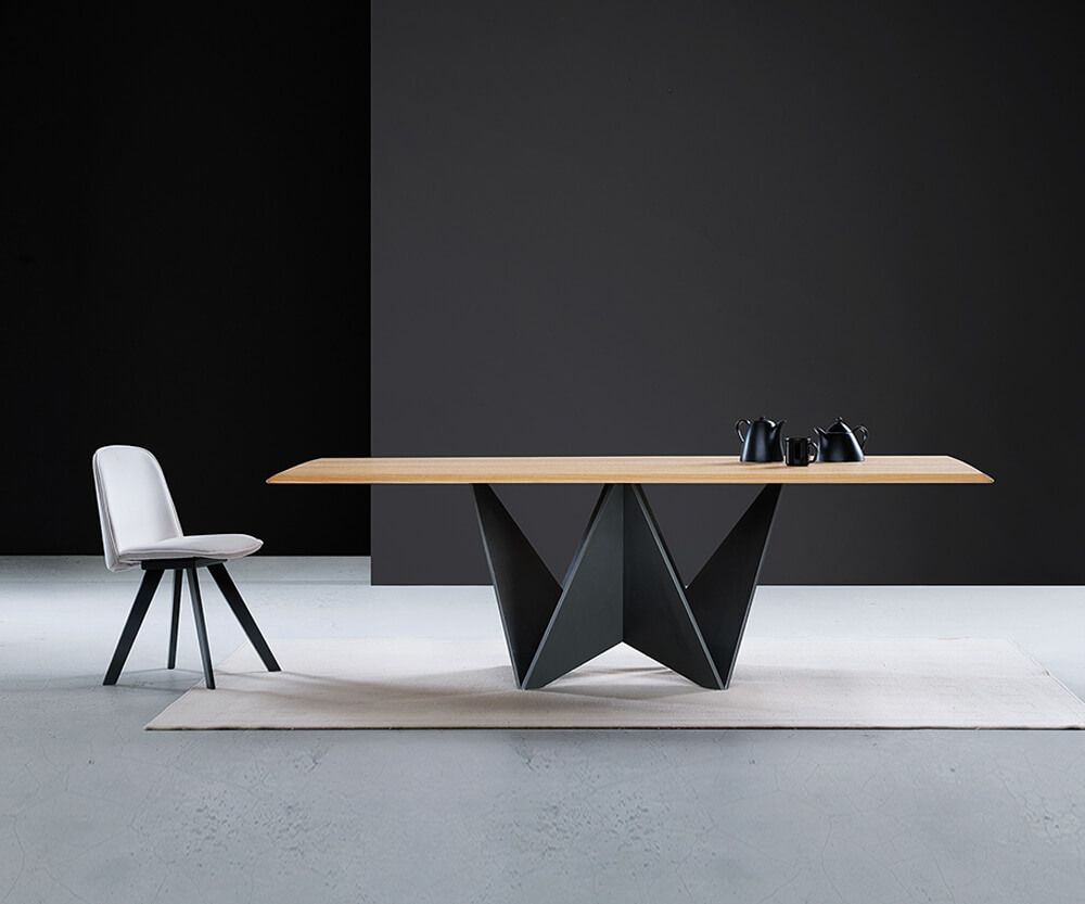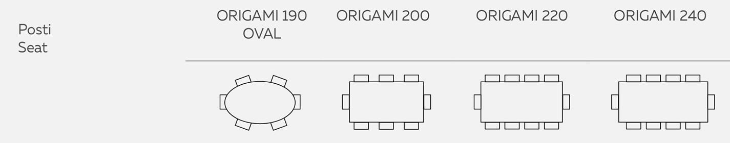 Ультра оригинальная основа стола напоминает традиционное японское искусство складывания бумаги. Столешница в версиях: деревянная в шпоне или цельном дубе, в элегантной версии со стеклом со скошенными краями, керамика. Стол Оригами также доступен в раскладной версии, за исключением версии из стекла и массива дерева.