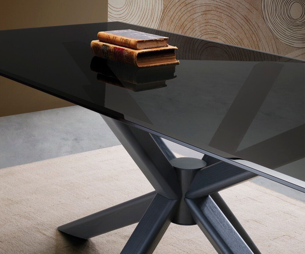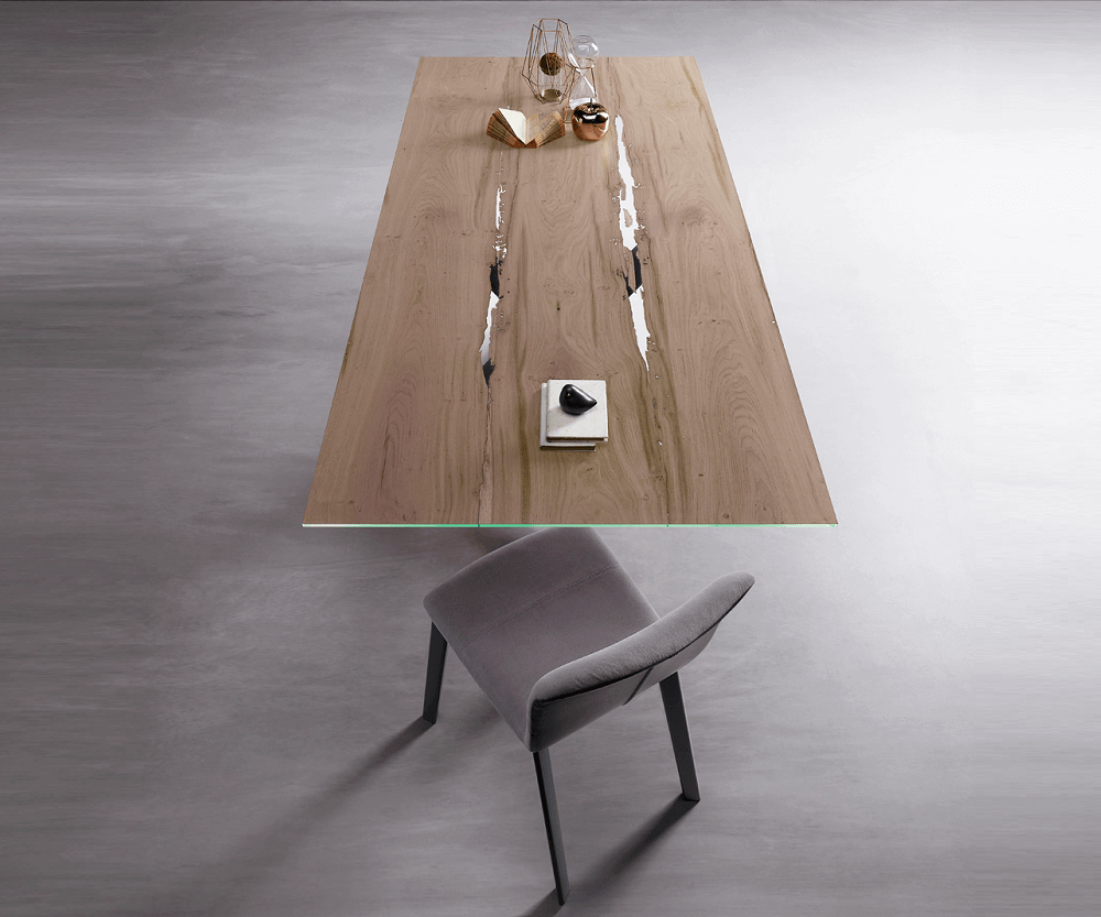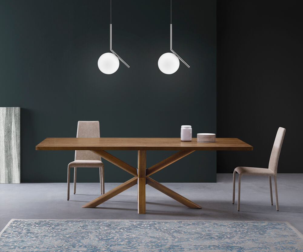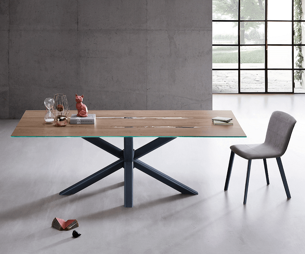 Овальная, прямоугольная или круглая столешница, изготовленная из стекла или шпона, опирается на хорошо сбалансированное основание с оригинальным дизайном. Стол также доступен в сложной версии из массива дуба.